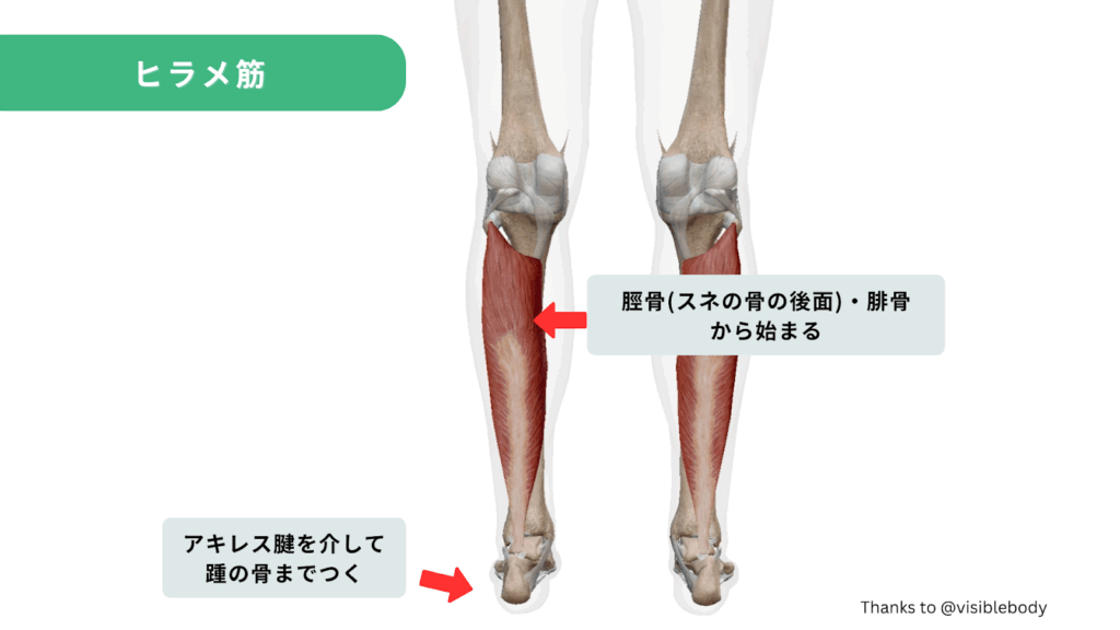ヒラメ筋の大きな走行としては、スネの裏〜踵(踵骨)につきます。