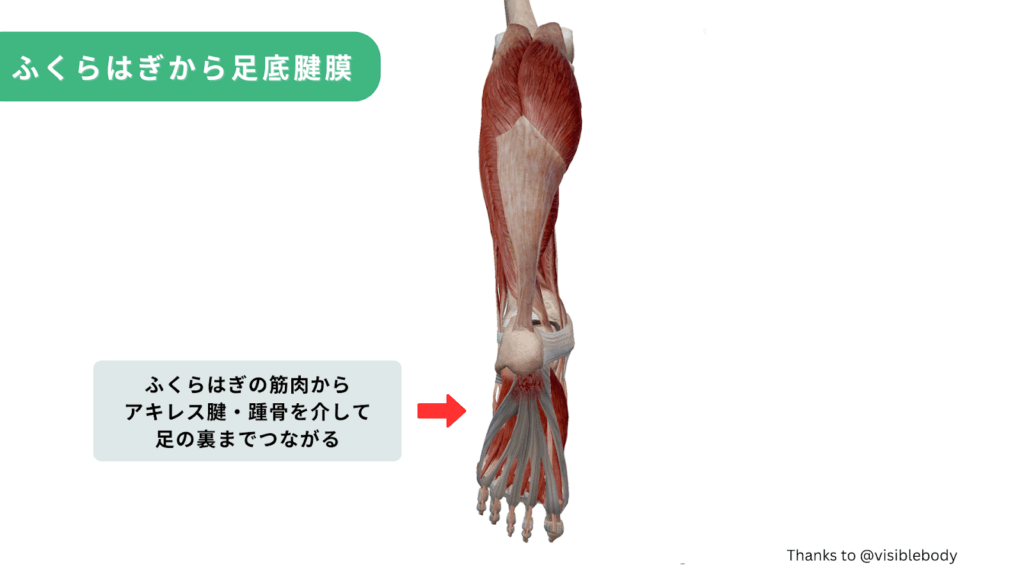 ふくらはぎの筋肉は、アキレス腱を介して、踵、さらには筋膜を介して足裏にまで繋がっています。