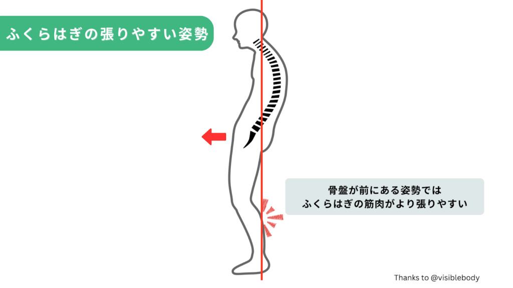 上記画像のように、「骨盤が前にあるような姿勢」の方は、骨盤の前移動を止めるようにふくらはぎ筋肉が働きます。そのため、ふくらはぎの筋肉が硬くなりやすいので要注意です。