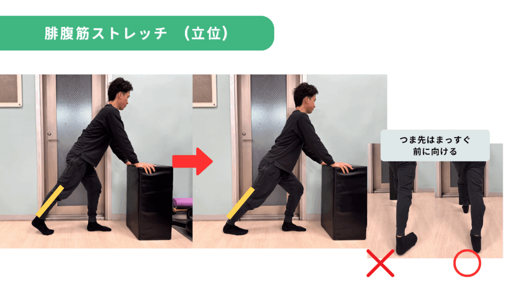 • ②つま先をまっすぐ向けた状態で踵を下ろす。