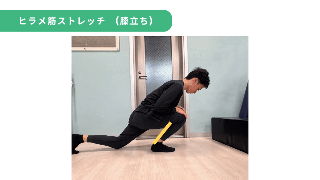 • ①膝立ちで、伸ばす側の膝を曲げた状態で前に体重をかける。