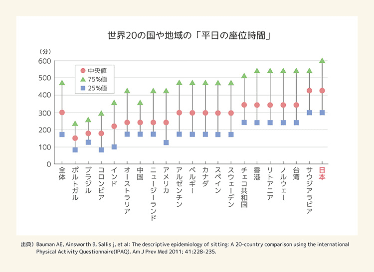 そのため、特に日本人においては座りすぎによる不調が起こりやすいと考えられます。(下図参照)
