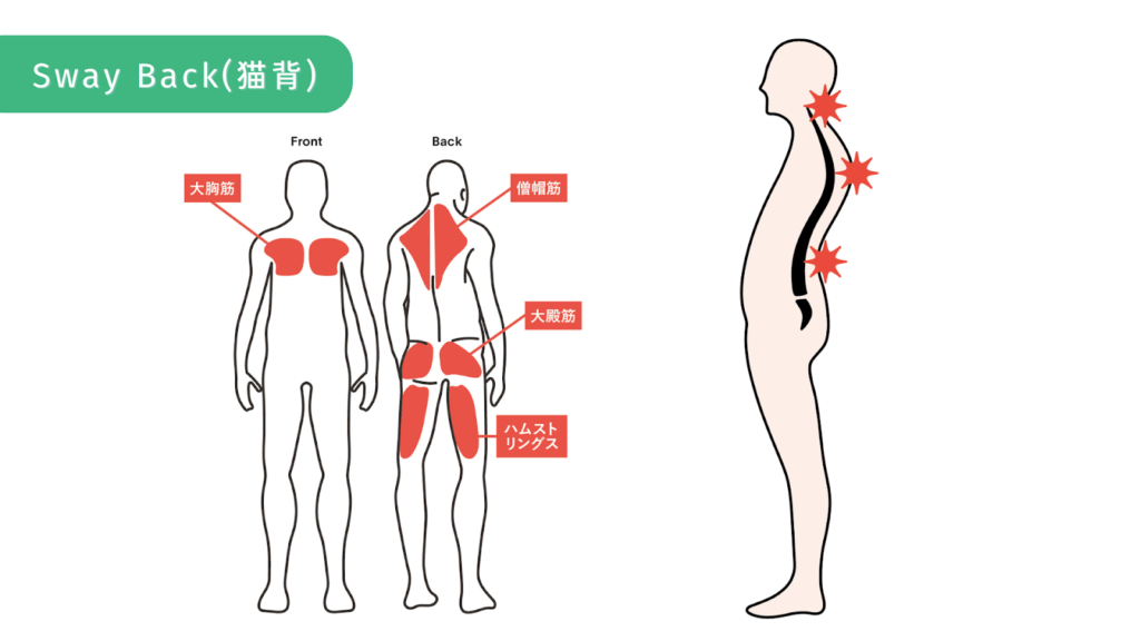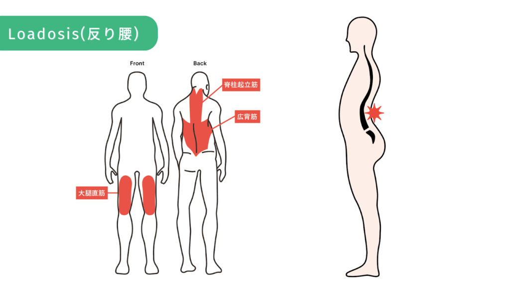 骨盤が後ろに倒れ、背中が丸まり腰や背中に負担がかかる