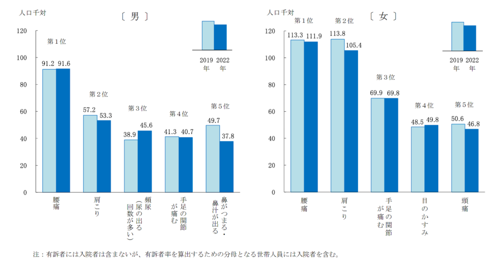 厚生労働省が2022年に行った国民生活基礎調査によると、国民の4人に1人は「病気やけが等で自覚症状のある者(有訴者)」であると言われています。男女ともに「腰痛」「肩こり」が1位、2位を独占していますが特に女性は肩こりの症状を抱えている割合が下記グラフからもわかると思います。