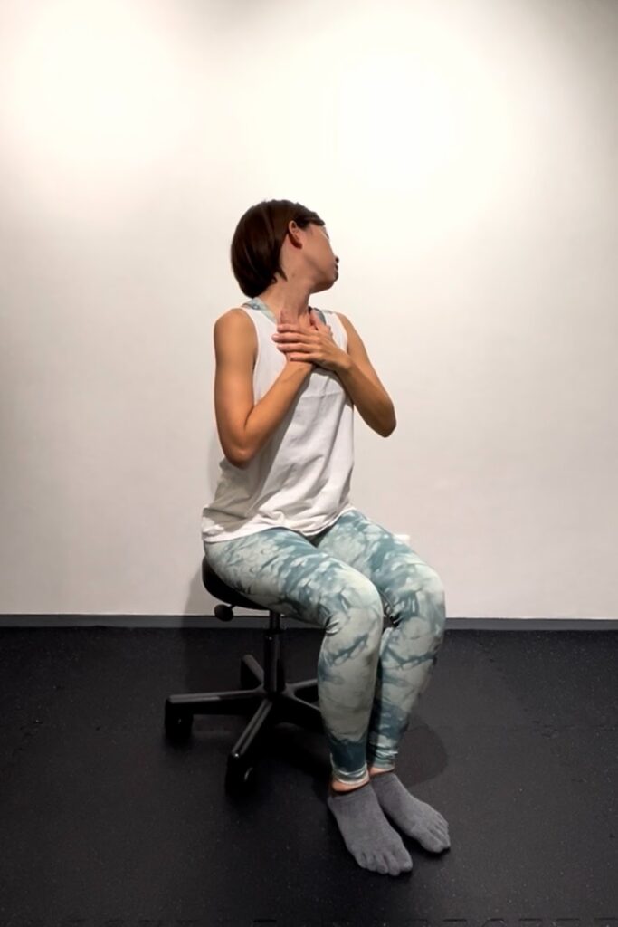 胸に手を当てて首を斜め後ろに倒す